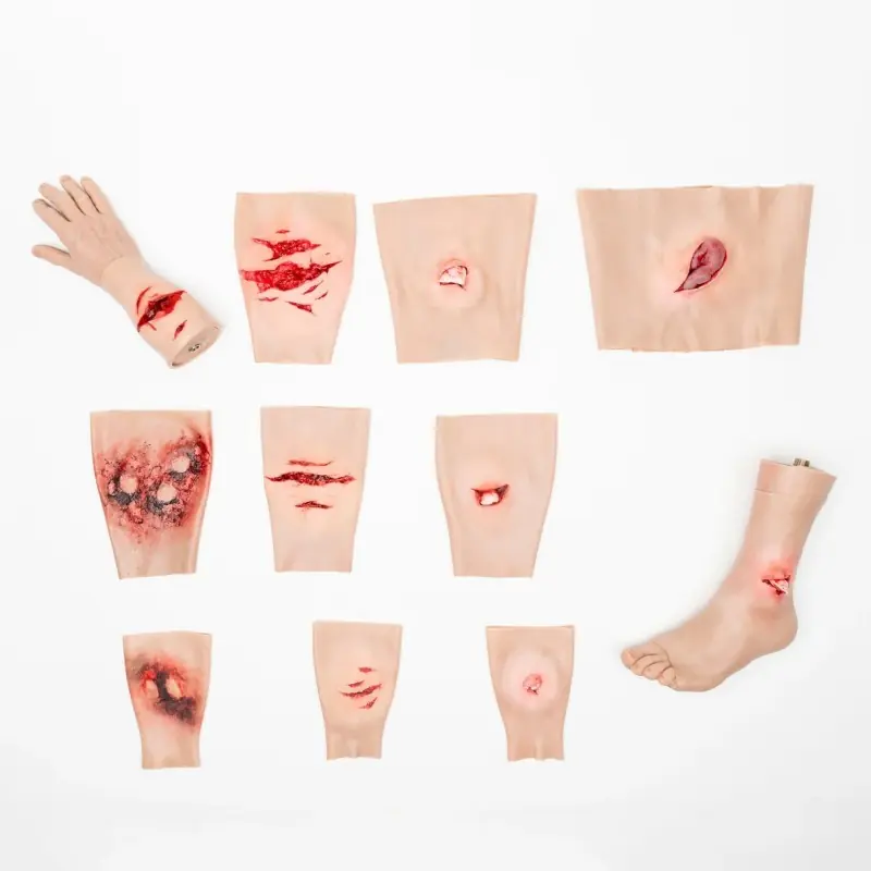 Kit with 11 different simulation sleeves, featuring a collection of diverse injuries ranging from open fractures, major wounds, full-thickness burns, and lacerations.