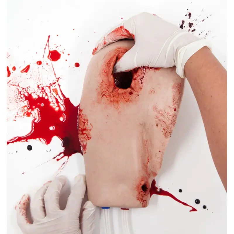 The SIM Shoulder Simulation Trainer is a silicone model of the human shoulder. It is made of prosthetic-grade platinum silicone, making it durable, washable, and reusable. It has two wounds with internally attached bleeding tubes, allowing for the simulation of significant hemorrhage.