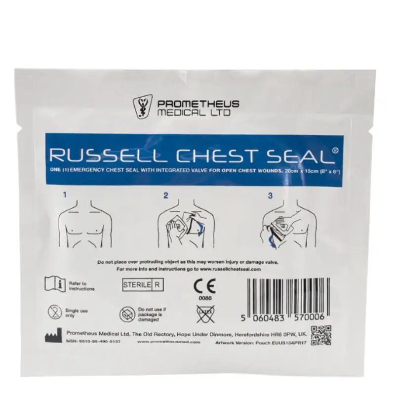 Russell Chest Seal® es un parche torácico no oclusivo y ventilado con cuatro aberturas y una válvula integrada para heridas torácicas abiertas.